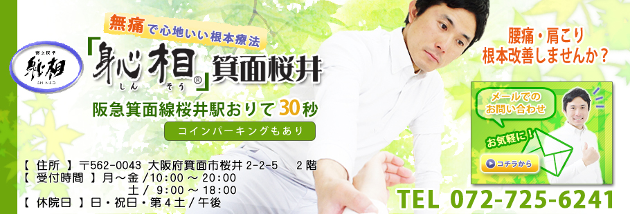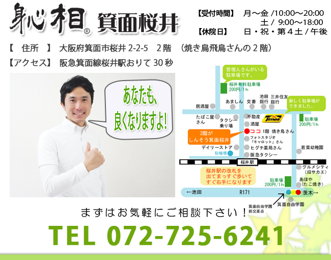 となったら、今度は自分が「このしんそう療方で辛い症状で苦しんでいる方を助けたい」という想いで「しんそう」の大阪研修会に参加して勉強し、現在ここ大阪府箕面市桜井で開業させて頂いています。