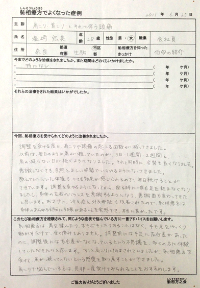 調整を受けるたびに、肩こりや頭痛の起こる回数が減って来ました。 以前は毎日のように肩が凝っていたのが、3日・1週間・2週間と肩の凝らない日が続くようになりました。それと同時に姿勢も良くなりました。 おまけに冷え性と外反母趾も改善されたのでしんそう療方は体のあらゆる部分に効果があることを実感でき、本当に良かったです。 肩こりで悩んでいる方は是非受けてみられることをおすすめします