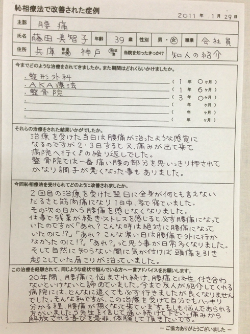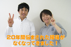 20年間悩まされ続け、腰痛とは一生付き合わないといけないと諦めていました。 今まで友人が紹介してくれる病院にはどんなに遠くても必ず行きましたが、よくなりませんでした。 そんな私ですが、このしんそう療方を受けて自分でもハッキリわかる程腰痛がなくなってきています。 もし悩んでおられる方がいましたら、先生を信じて通い続けて下さい。痛みから解放される喜びを体験して頂きたいです。