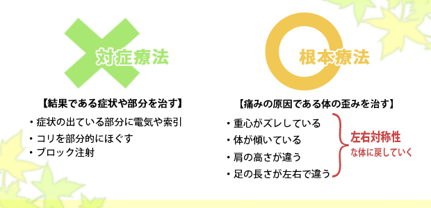 コリをほぐしたり、症状の出ている部分ばかりを施術するのは対症療法なのです。