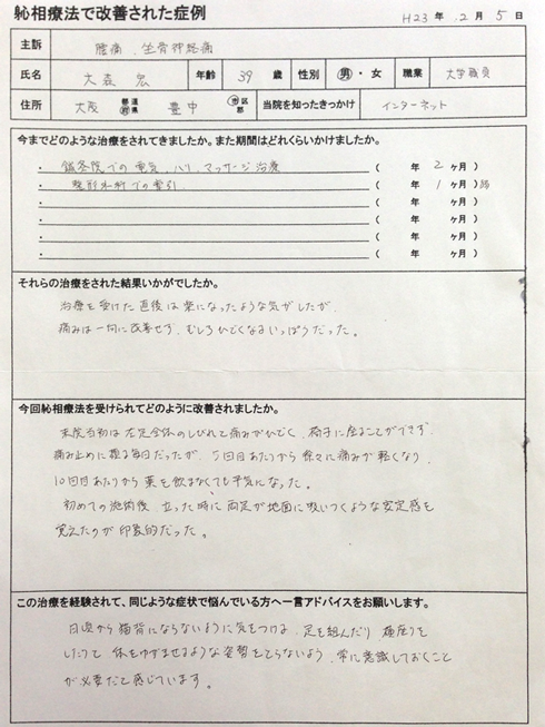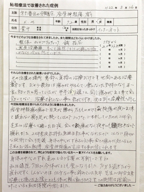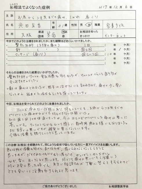 先生に治療していただいた日の夜、全くの鈍痛がなく夜中にも起きないで寝られました。20年来気持よく熟睡できたことがなかったのにこんなに穏やかな施術で全く不思議。