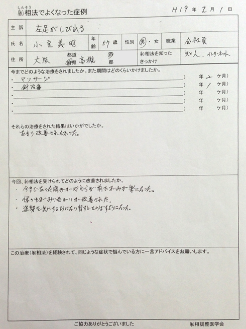 来院当初は左足全体のしびれと痛みがひどく、椅子に座ることができず、痛み止めに頼る毎日だったが、5回目あたりから徐々に痛みが軽くなりました。
