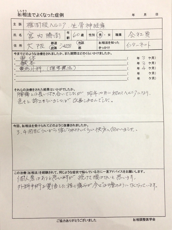 外科手術を覚悟した程の痛みが今では嘘のようになくなっています。