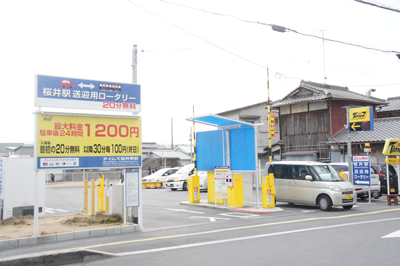 最も近い駐車場は三井住友銀行と泉州池田銀行前にある「Times」です。